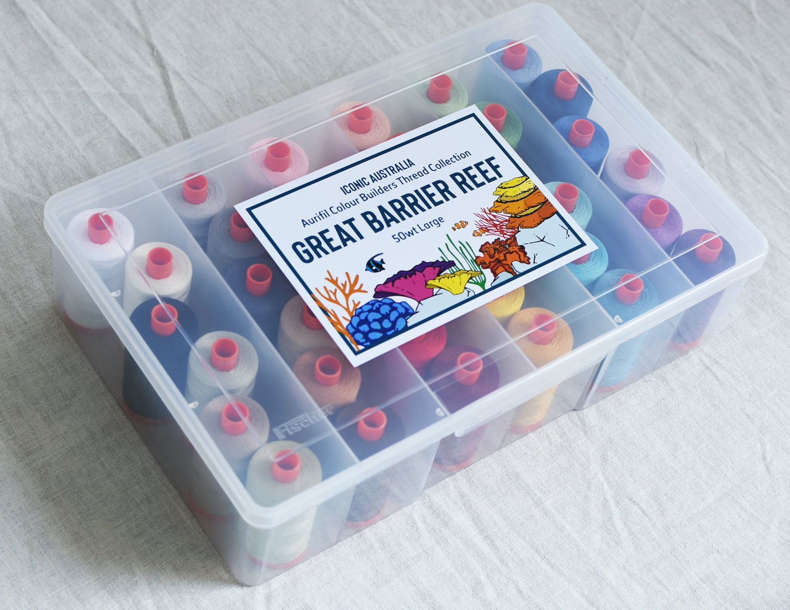 Our 50wt Colour Builders Thread Collection is built around the vibrant colours of the Great Barrier Reef. Inspired by the vivid flora and fauna of our mysterious underwater world, this collection showcases the brilliant colours of the reef fish, blooming coral and sparkling water.