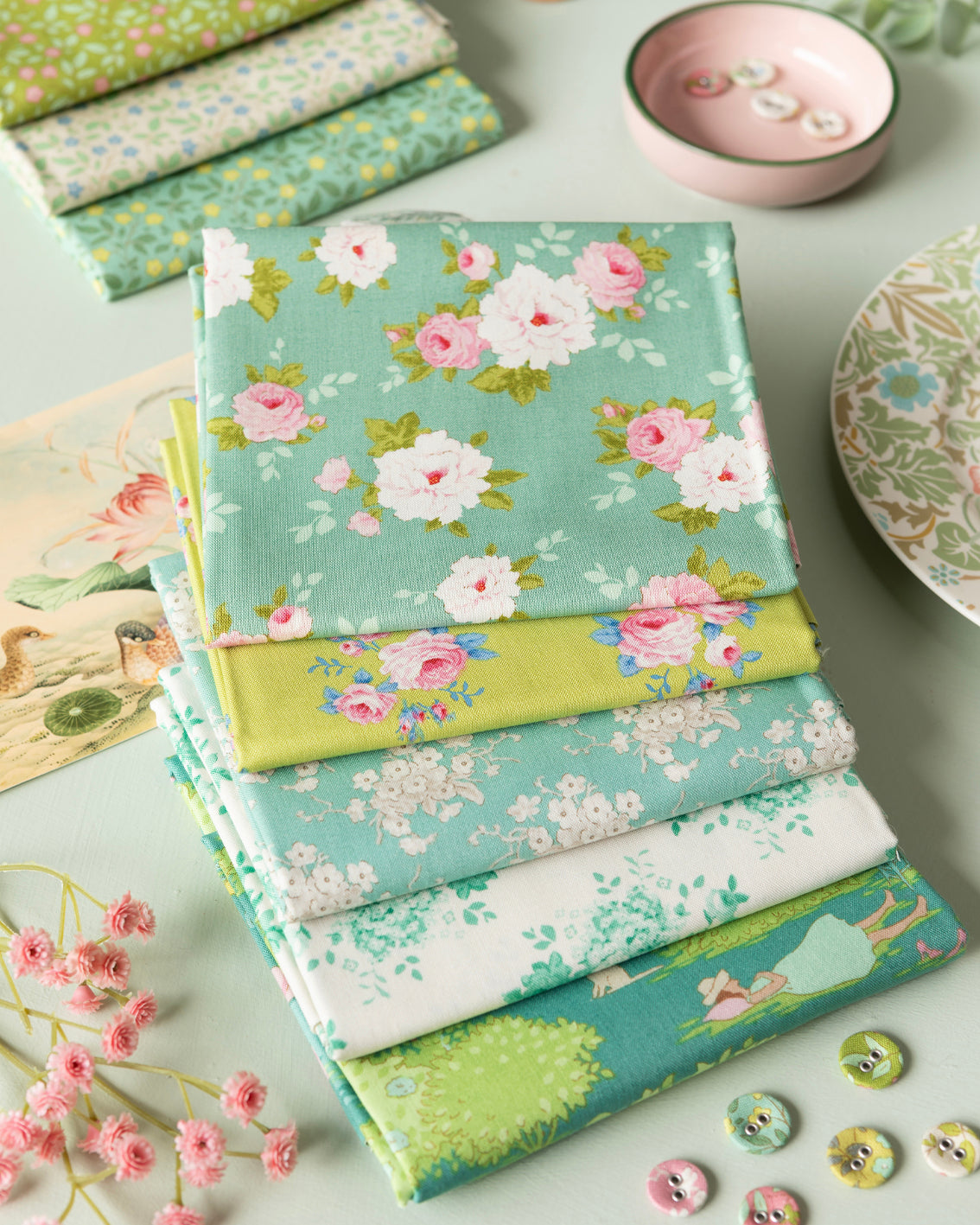This collection is great for soft and dreamy summer quilts and for creating the ultimate vintage summerhouse style. The colour palette is gentle but with a dash of sour for freshness, with colors ranging from teal, green, soft greys and yellows to ginger, pinks, blues and sand.