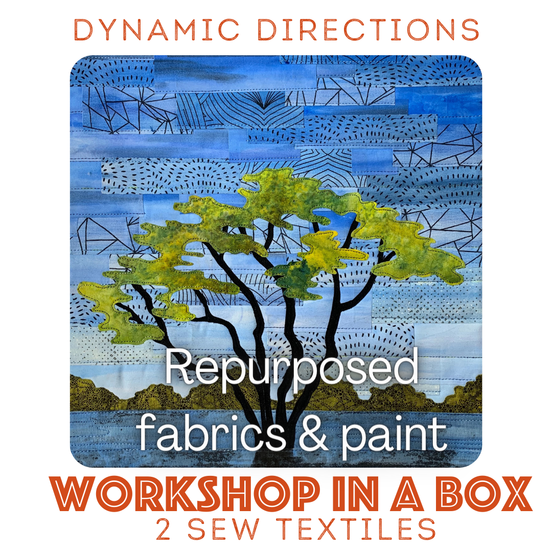 DYNAMIC DIRECTIONS: Was a visual feast of finished projects. Gloria Loughman taught us to take a new look at boring fabric, and redirect them into dynamic outcomes. A hand painted background by Gloria was included in each box, as were the "boring" fabrics and Gloria's favourite fabric paint, a foam brush and pattern.