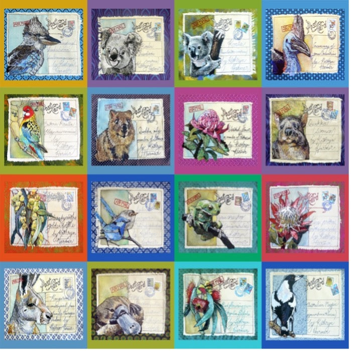 Il s'agit d'impressions sur tissu de haute qualité de la série originale de points et de fibres « PostCard » de Kathryn Harmer représentant des animaux sauvages d'Afrique et d'Australie. Les originaux (voir produits séparés) sont peints, cousus et intègrent des fibres.